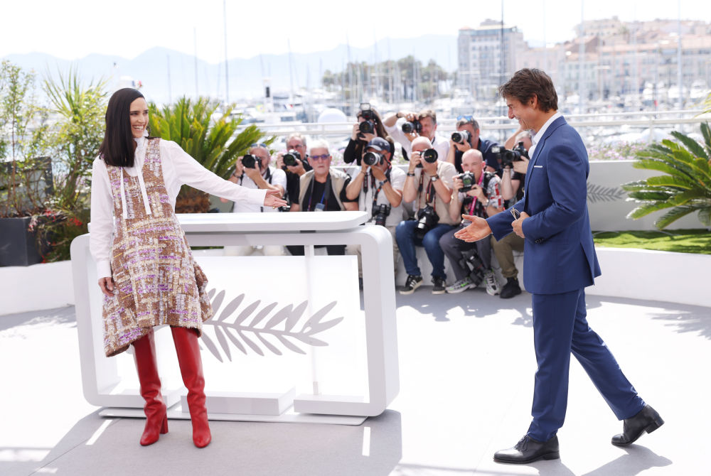 ↑2022年5月18日,美國演員湯姆·克魯斯(右)和詹妮弗·康納利亮相影片《壯志凌云:獨行俠》的拍照式。