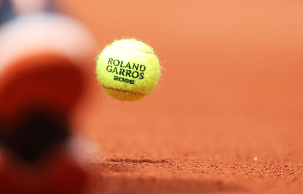 ↑2022年5月25日在2022法國網(wǎng)球公開(kāi)賽比賽現場(chǎng)拍攝的一顆網(wǎng)球。
