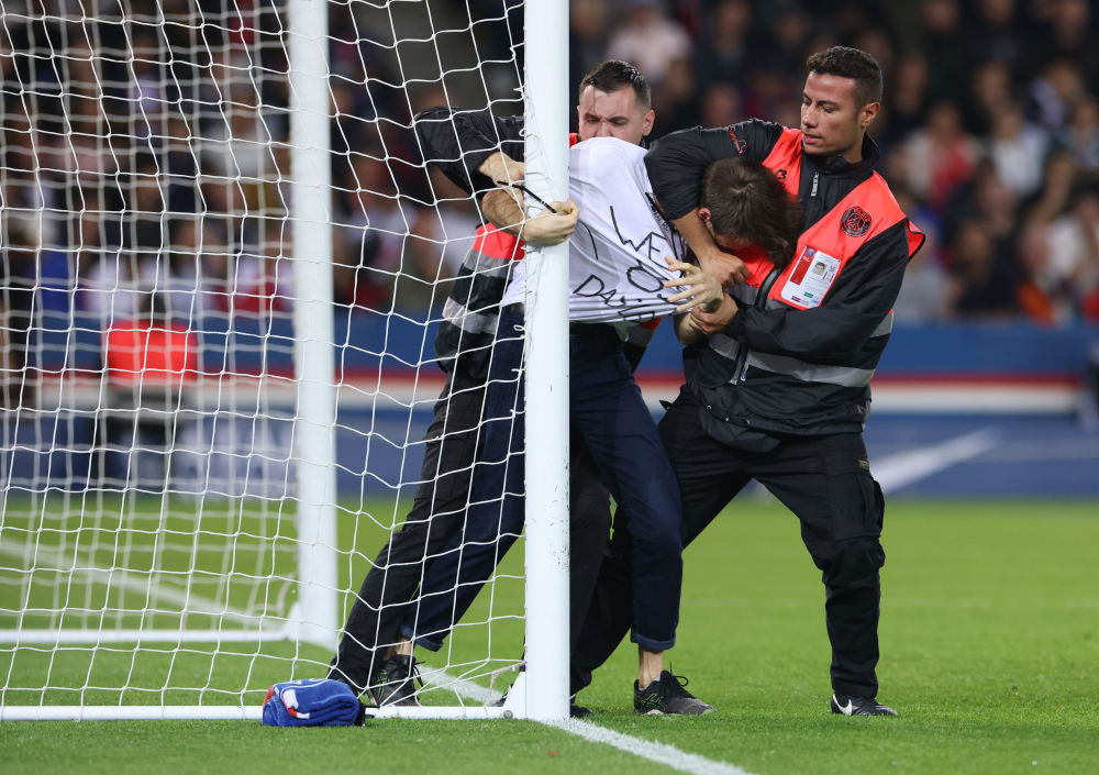 ↑2022年10月16日,在2022-2023賽季法國足球甲級聯(lián)賽第11輪比賽中,安保人員將闖入球場(chǎng)的示威者抬走。