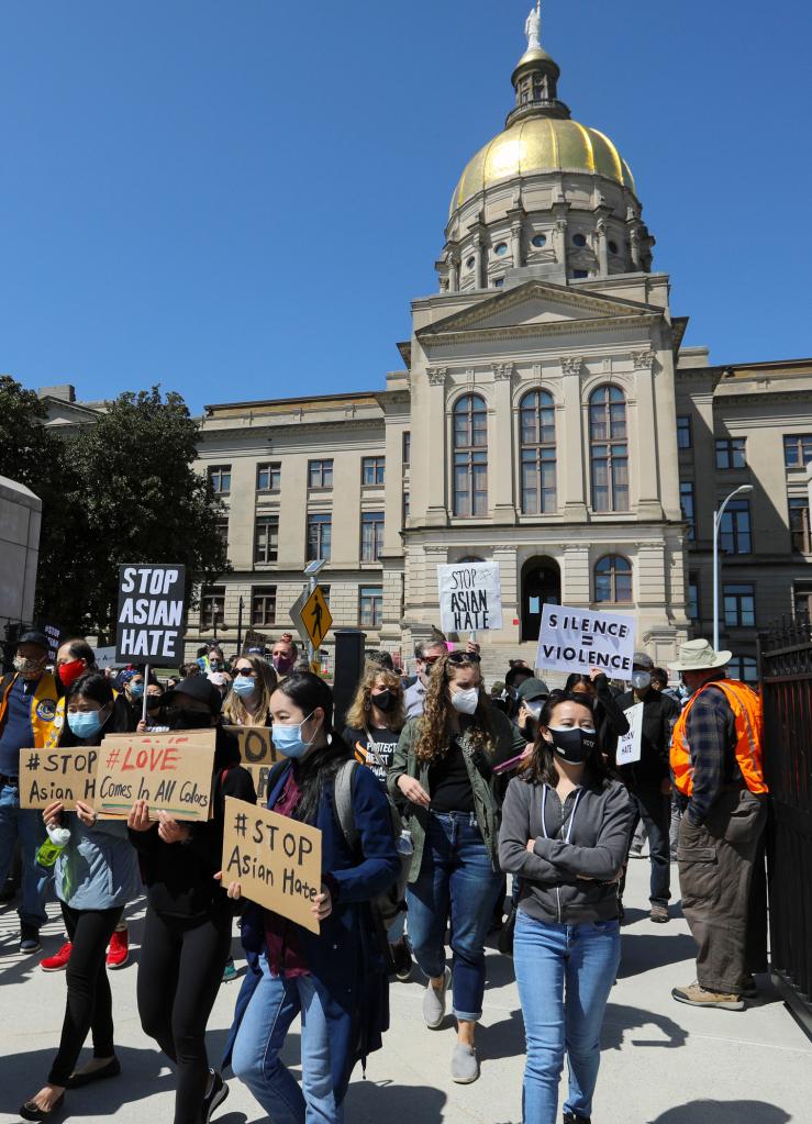 2021年3月20日,人們手持標語(yǔ)在美國佐治亞州亞特蘭大市的佐治亞州議會(huì )大廈前舉行集會(huì ),抗議針對亞裔的暴力、種族歧視和仇外情緒,要求為亞特蘭大槍擊案受害者伸張正義。新華社發(fā)(王曉衡攝)