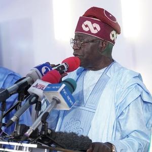 3月1日,在尼日利亞首都阿布賈,尼日利亞當選總統博拉·蒂努布(中)發(fā)表勝選講話(huà)。新華社發(fā)(埃馬·奧索蒂 攝)