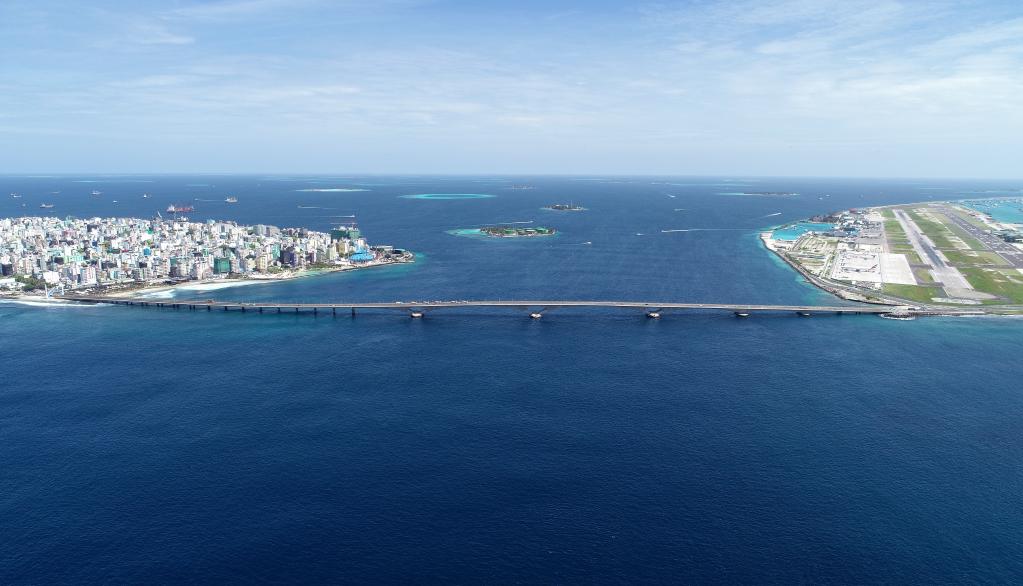 這是在馬爾代夫航拍的連接首都馬累和機場(chǎng)島的中馬友誼大橋(2019年8月30日攝)。新華社發(fā)(王明亮攝)
