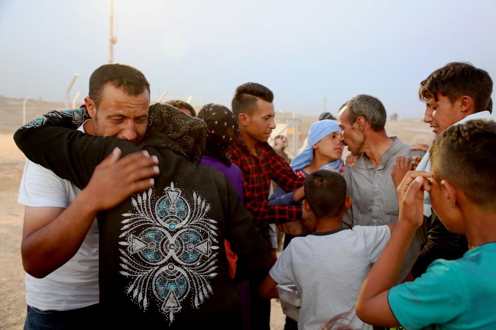 2017年5月30日,在伊拉克摩蘇爾東部約30公里處的哈桑沙姆U2安置營(yíng)地,剛從交戰區撤出的平民見(jiàn)到家人相擁而泣。新華社發(fā)(哈利勒·達伍德攝)