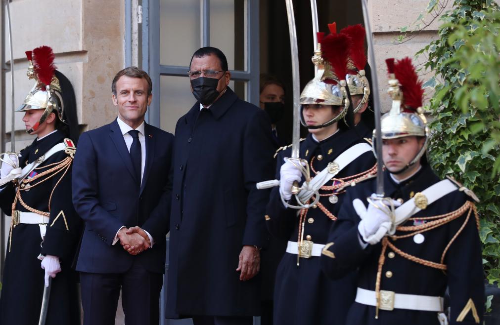 2021年11月12日,法國總統馬克龍(左二)在法國巴黎歡迎尼日爾總統巴祖姆(左三)。(新華社記者高靜攝)
