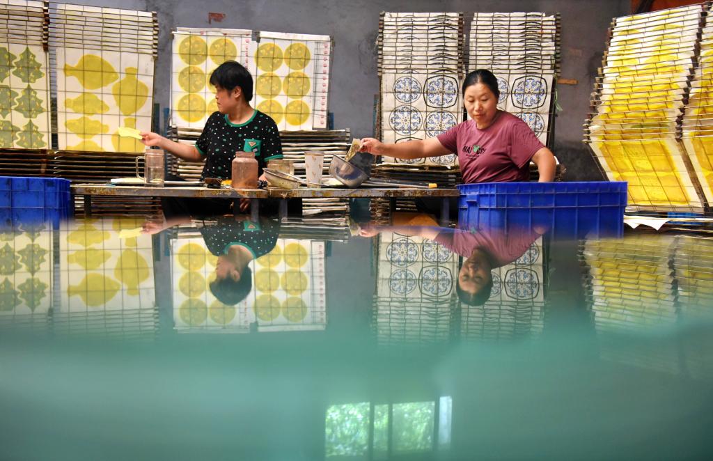 8月15日,在山東省淄博市沂源縣悅莊鎮東埠村一玻璃制品企業(yè),工人對玻璃進(jìn)行貼畫(huà)加工。新華社發(fā)(趙東山攝)