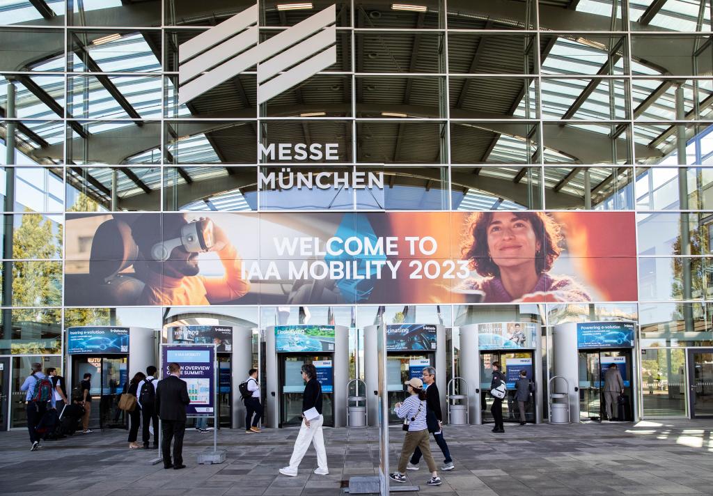 9月5日,在德國慕尼黑,人們走入2023年德國國際汽車(chē)及智慧出行博覽會(huì )會(huì )場(chǎng)。新華社記者張帆攝