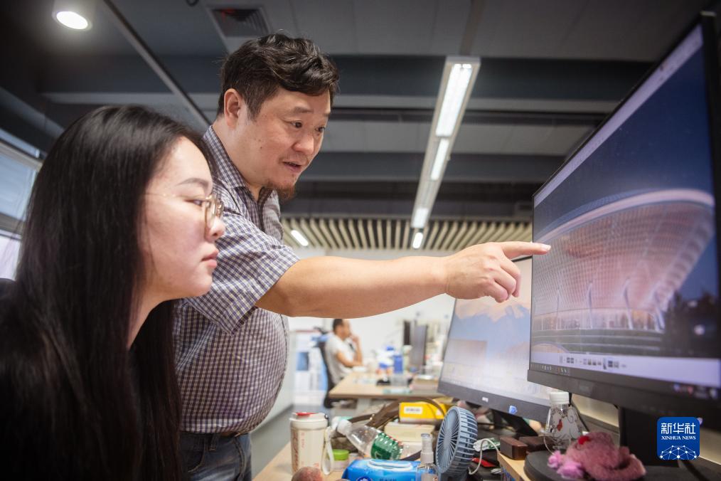 9月12日,在武漢中南建筑設計院總部,唐文勝(右)與同事交流中部非洲文化藝術(shù)中心設計方案。新華社記者 伍志尊 攝