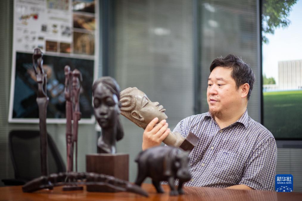 9月12日,在武漢中南建筑設計院總部,唐文勝介紹他收藏的非洲木雕作品。新華社記者 伍志尊 攝