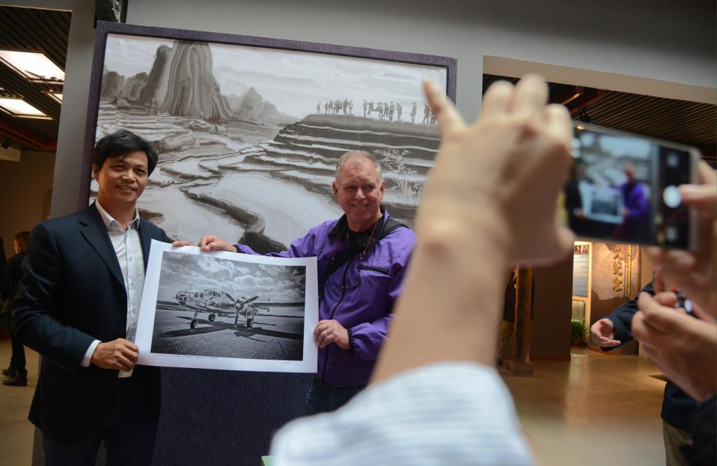 2018年10月25日,在衢州訪(fǎng)問(wèn)的美國雷德溫市攝影家向紀念館捐贈他拍攝的杜立特突襲行動(dòng)同型轟炸機照片。(王飛 攝)