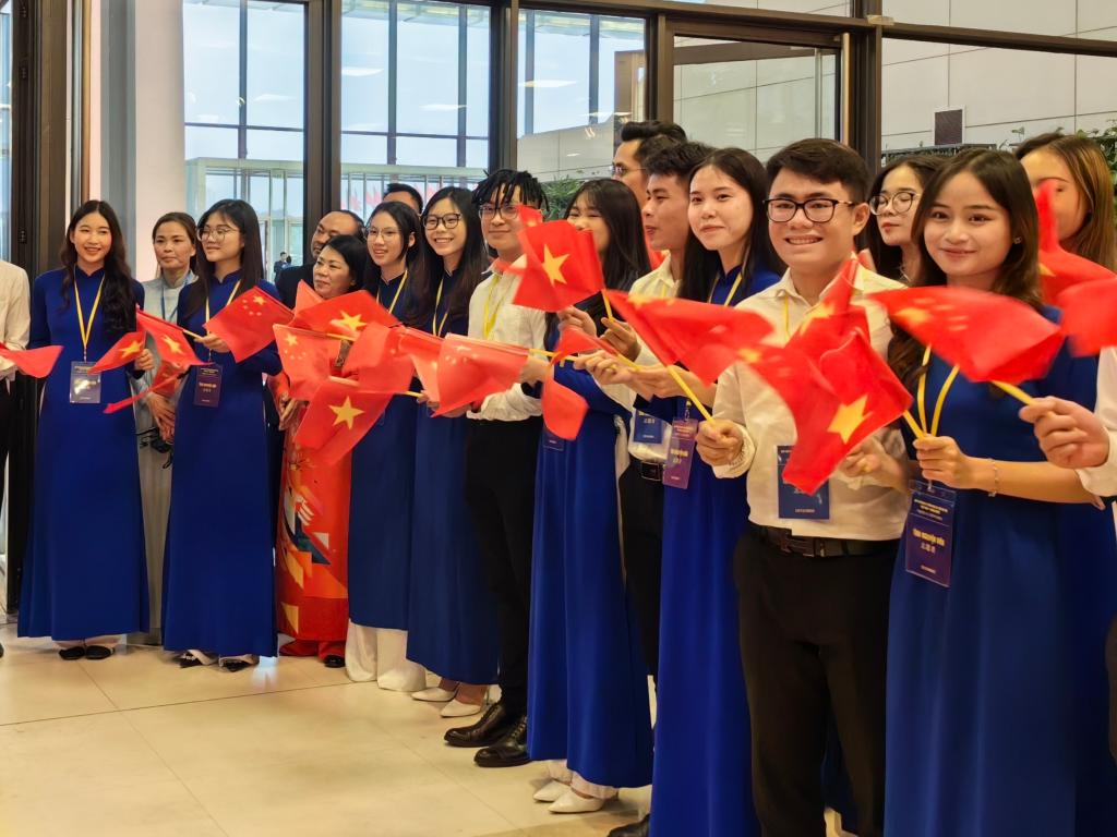 12月13日下午,河內國家會(huì )議中心,身著(zhù)白襯衫和藍色奧黛的越南青年男女,手持鮮花和越中兩國國旗,翹首期盼著(zhù)激動(dòng)人心的時(shí)刻——